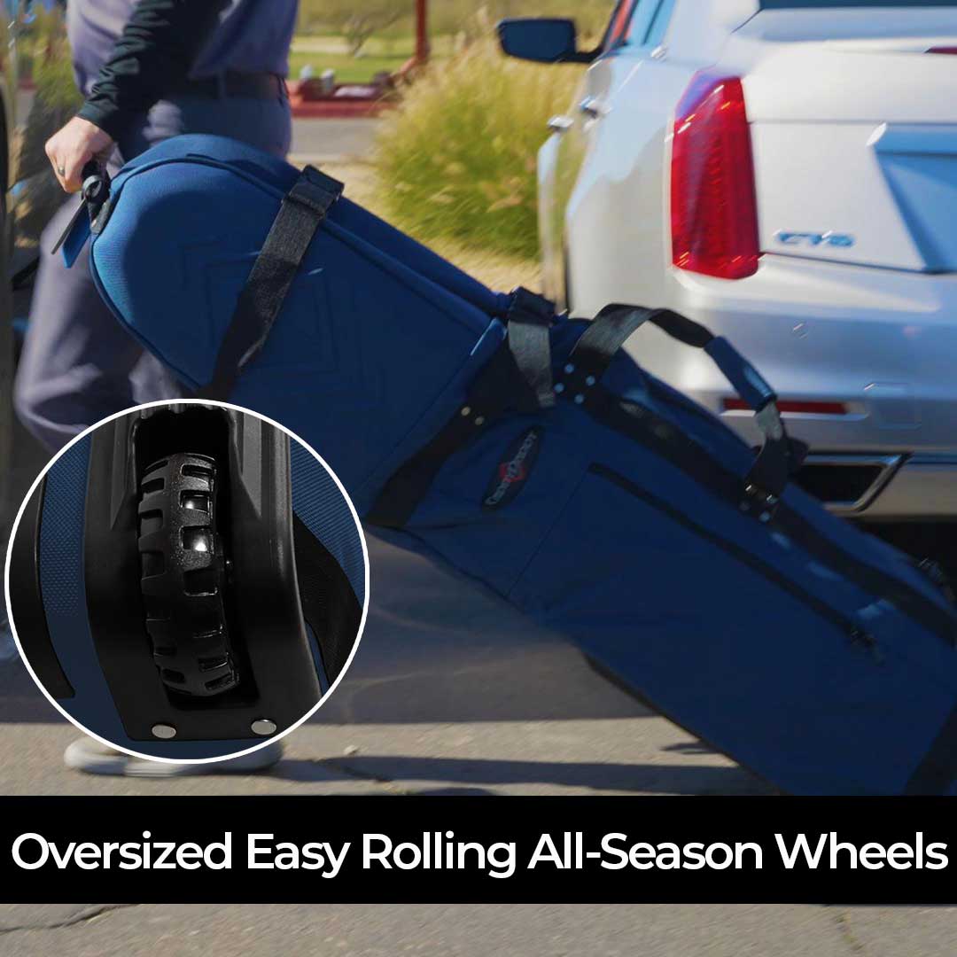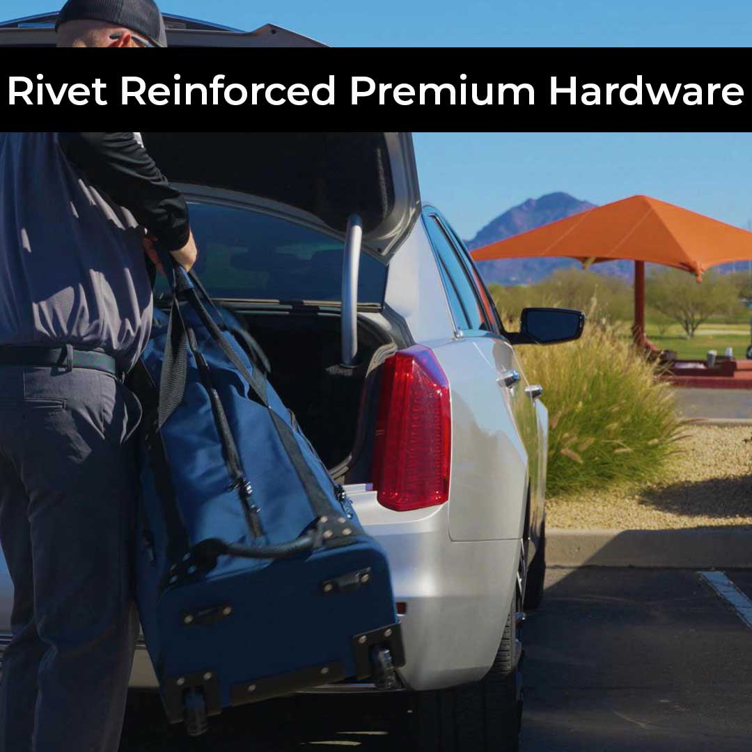Our top-of-the-line First Class golf travel cover has received numerous awards from media experts including Forbes, MyGolfSpy and Travel & Leisure.   Ballistic nylon construction, YKK oversized lockable zippers and military grade components and wheels are components you may find on much more expensive bags from competitors.  We’re so confident in the First Class series quality and build, we back it up with a full 2 year no questions asked replacement warranty that even covers airline negligence.  The custom dual padded top includes an inside later of foam with a second layer of semi-rigid EVA foam which provides some of the best protection available.