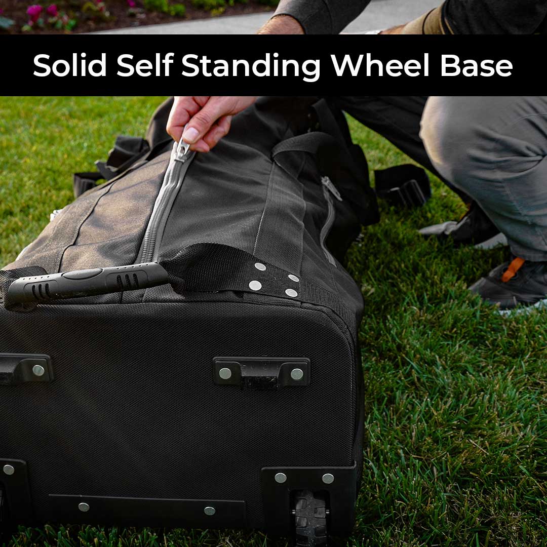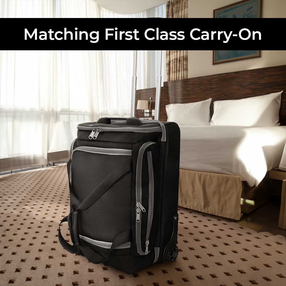 The full stand up wheel base allows you to stand the bag upright when traveling without tipping.  Skid rails and oversized wheels helps the First Class roll with ease through airports.