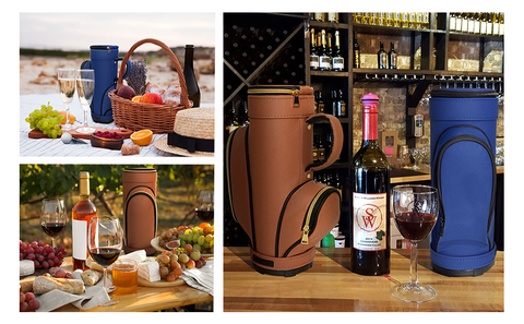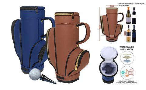 Our Premium Synthetic Leather Wine Golf Cooler Bags are designed to keep wine or champagne chilled and ready to drink. The cooler was designed for golf enthusiasts and wine lovers, making it a versatile gift that embodies a seamless fusion of leisure and luxury. Encased in premium synthetic leather fabric, this chic accessory effortlessly exudes opulence and sophistication. It is ingeniously designed to cater to the needs of wine or champagne connoisseurs who appreciate the finer things in life. This versatile cooler is not just limited to style on the golf course; it's perfect for picnics, beach outings, BBQs, and any outdoor occasions where you want to enjoy chilled wine or champagne in style. Its smooth, polished appearance adds a touch of class to any occasion, whether you're teeing off on the fairway or gathering with friends at a picnic. The leather used is 100% faux, so it's vegan. It's a testament to our commitment to luxury, allowing you to indulge in the finest materials guilt free.