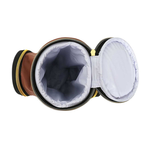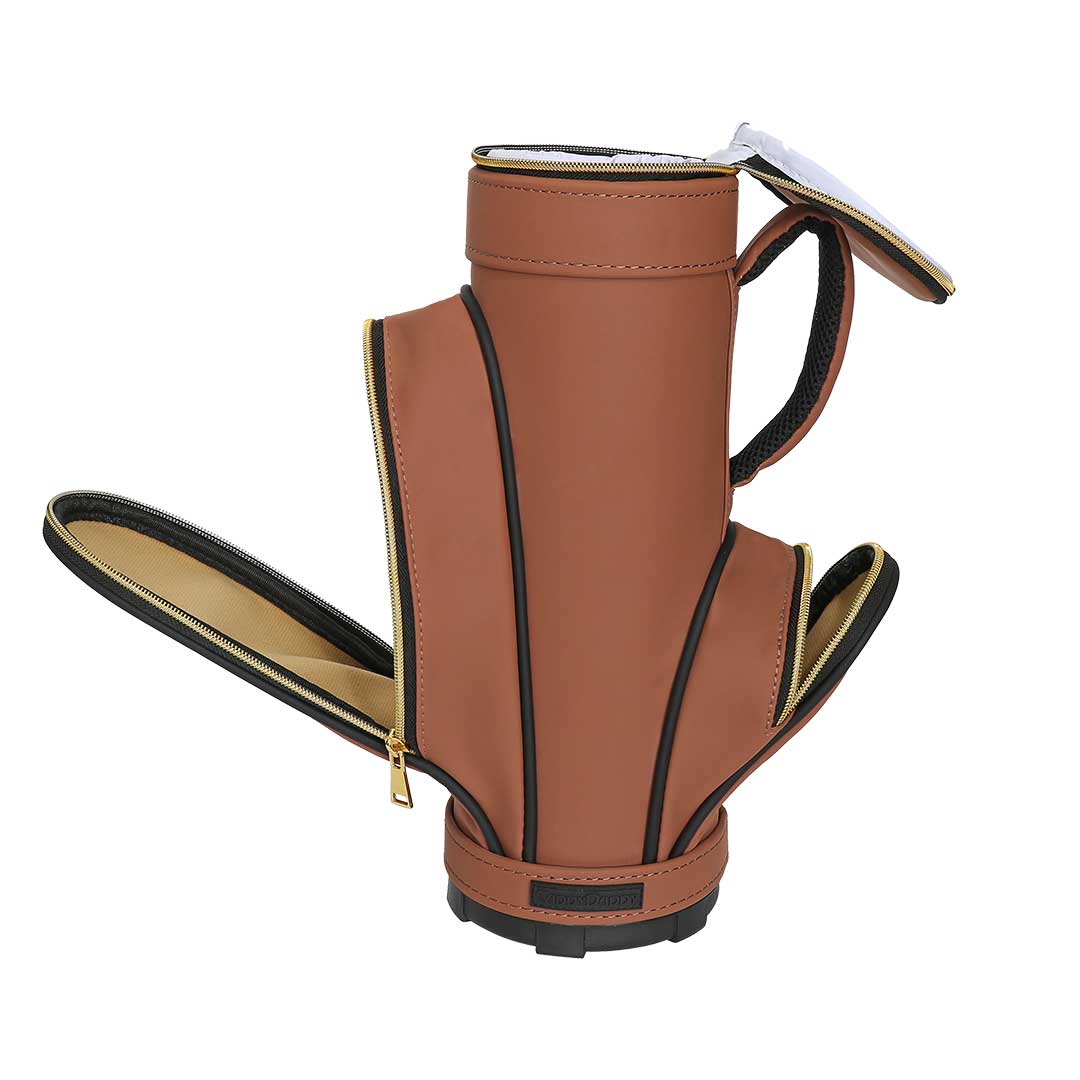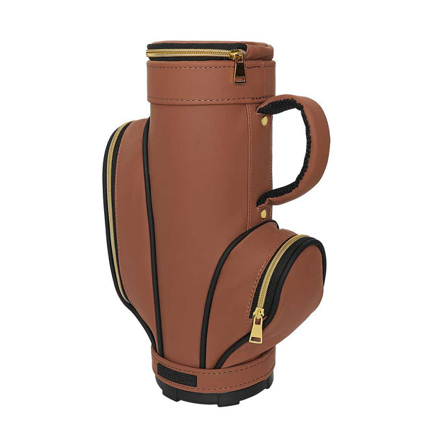 Our Premium Synthetic Leather Wine Golf Cooler Bags are designed to keep wine or champagne chilled and ready to drink. The cooler was designed for golf enthusiasts and wine lovers, making it a versatile gift that embodies a seamless fusion of leisure and luxury. Encased in premium synthetic leather fabric, this chic accessory effortlessly exudes opulence and sophistication. It is ingeniously designed to cater to the needs of wine or champagne connoisseurs who appreciate the finer things in life. This versatile cooler is not just limited to style on the golf course; it's perfect for picnics, beach outings, BBQs, and any outdoor occasions where you want to enjoy chilled wine or champagne in style. Its smooth, polished appearance adds a touch of class to any occasion, whether you're teeing off on the fairway or gathering with friends at a picnic. The leather used is 100% faux, so it's vegan. It's a testament to our commitment to luxury, allowing you to indulge in the finest materials guilt free.
